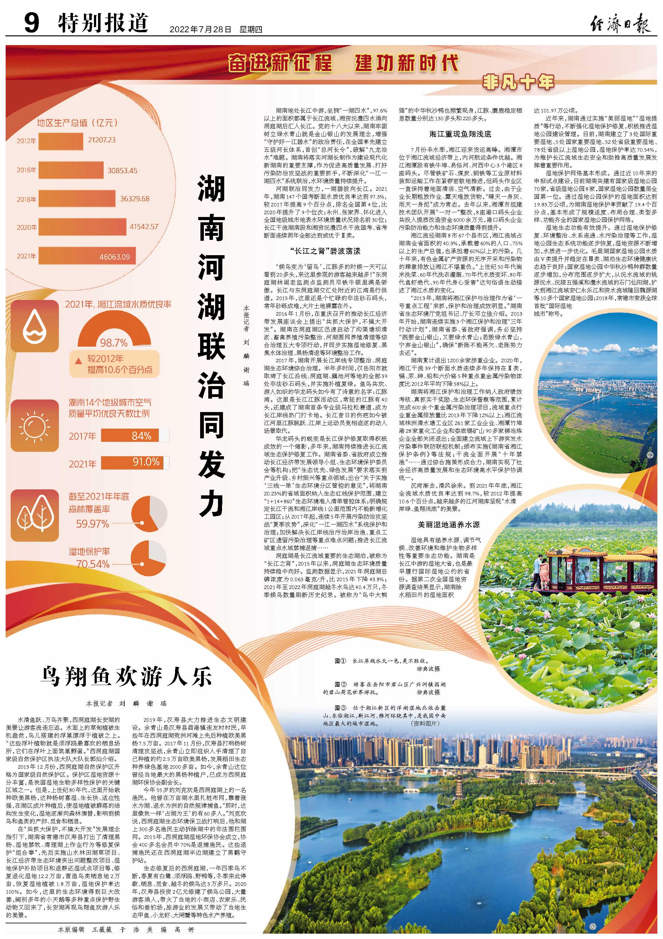 近年来,湖南通过实施“美丽湿地”“湿地提质”等行动,不断强化湿地保护修复,积极推进湿地公园建设管理。目前,湖南建立了3处国际重要湿地、5处国家重要湿地、52处省级重要湿地、78处省级以上湿地公园,湿地保护率达70.54%,为维护长江流域生态安全和助推高质量发展发挥着重要作用。