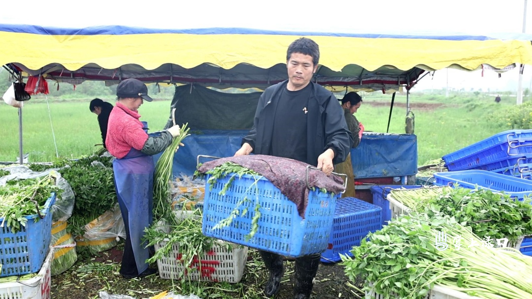 十多位村民分工协作,有的负责采割,有的负责去掉老根、摘去黄叶,有的负责清洗……最后,一把把捆扎整齐的水芹被装入框中,准备运往中南农贸市场。