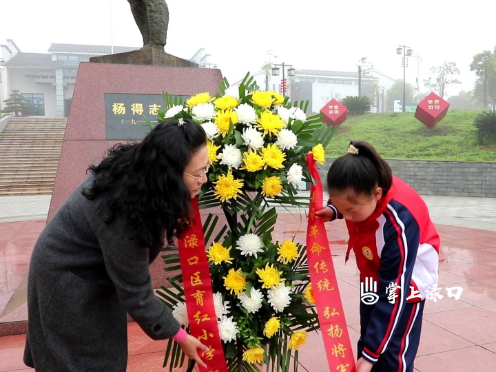 上午9时,杨得志铜像广场前庄严肃穆。佩戴党员徽章的育红小学党员教师和身着校服、系红领巾的少先队员整齐列队。在将军铜像前,党员代表与少先队员代表共同敬献花篮,全体人员默哀致敬。