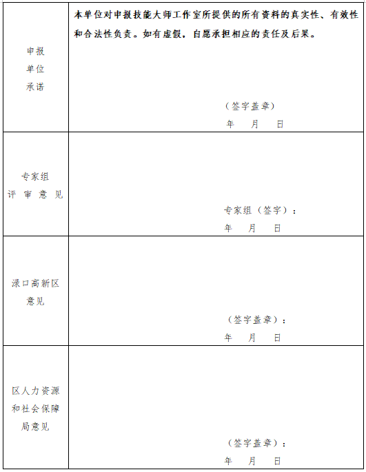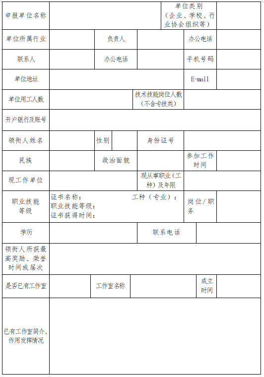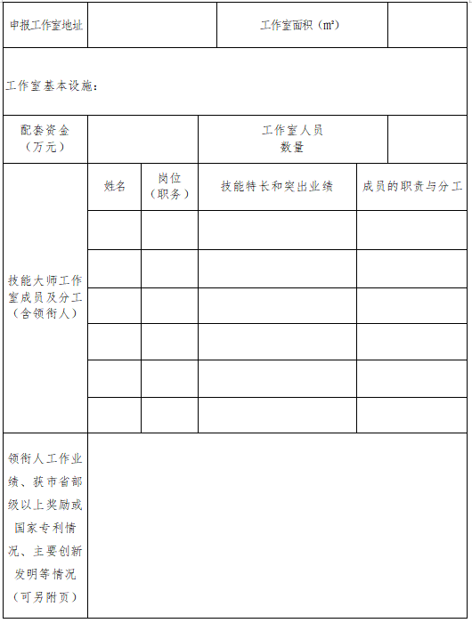 2.申报报告。申报技能大师工作室职业(工种)、技能大师工作室成立的必要性和现有优势、领衔人简介、技能大师工作室配套管理制度和技能大师工作室计划目标(含技术攻关、带徒计划)等;