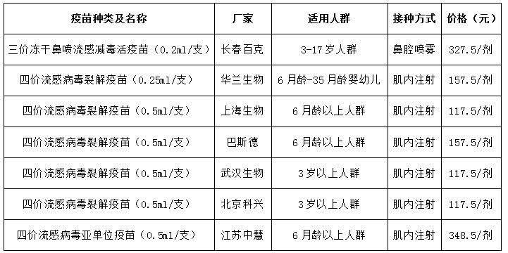 渌口区接种门诊供应哪几种流感疫苗?渌口区现供应三价减毒活疫苗和四价灭活疫苗,具体种类和价格见下表,详情请咨询就近预防接种门诊。
